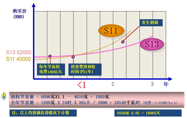 單臺(tái)預(yù)計(jì)節(jié)能效果 (500kVA) S13I級(jí)與S11國(guó)標(biāo)比較